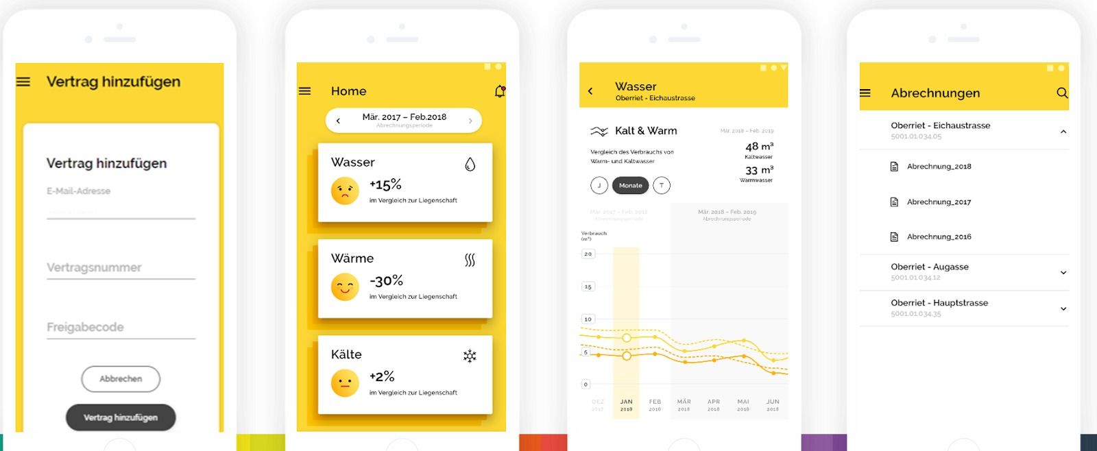 NeoVac myEnergy brings metering data into the tenant app. Users view monthly consumption, compare with neighbors and last year, and access all utility bills. Data is delivered from the NeoVac cloud. Available for properties with a NeoVac billing contract and categories such as water or heating.
